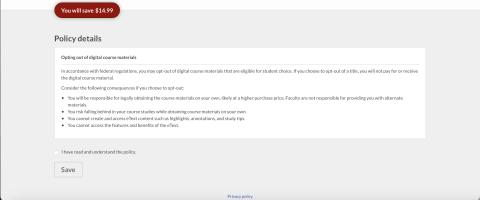 - If you make a change to your digital course materials, you will need to review your institution's student choice policy terms and conditions. If you agree to the terms, place a check next to “I have read and understand the policy."