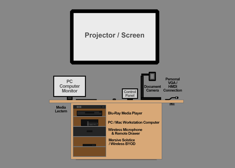 - Lectern features HDMI personal device connection, allowing a personal device with an HDMI port to project through the learning space's A/V system